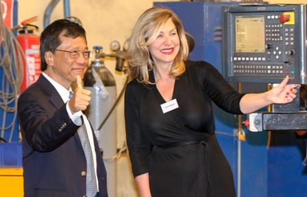 在水晶邮轮母公司云顶香港有限公司主席兼行政总裁丹斯里林国泰、Lloyd Werft 船厂董事总经理Rüdiger Pallentin 先生及德国本地商会代表的见证下,罗德里格斯女士按动切割钢板的仪器,正式启动水晶河川邮轮的建造工程。