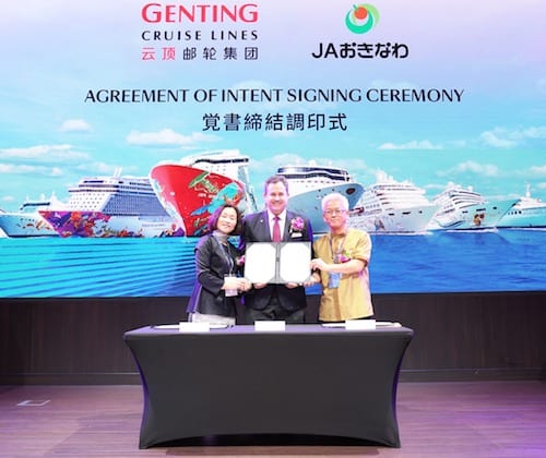 正值「世界梦号」抵达冲绳那霸,星梦邮轮总裁戴卓尔·布朗先生(Thatcher Brown)代表云顶邮轮集团与冲绳县农业协同组合在「世界梦号」上签订了此项合作意向协议书,并表示:“云顶邮轮集团与冲绳的渊源可以追溯到1997年旗下邮轮首次挂靠那霸,时至今日,冲绳早已成为我们最受欢迎的夏季目的地之一。我们很高兴可以成为首家与冲绳县农业协同组合以及Leospo Inc.展开合作的邮轮公司,在今夏多达160个冲绳航次中为星梦邮轮以及丽星邮轮的旅客独家提供当地美食及土产,从船上到岸上,全程呈献正宗冲绳滋味。”