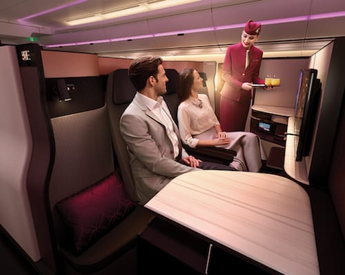 卡塔尔航空商务舱座椅的设计经过仔细考量,其中不乏奢华细节设计,如手工缝制的意大利真皮以及缎面玫瑰金镶嵌,这些细节无不彰显卡塔尔航空商务舱的高端、私密且极具个性。为进一步提升旅客乘机体验,卡塔尔航空还推出了全新的机上餐饮概念,除了精心设计的机上菜单及已有的“点餐”服务外,Qsuite商务舱菜单还将为旅客全程提供小吃拼盘,配上精致的瓷器餐具和刀具,让旅客在35,000英尺的高空体验美食社交。Qsuite还可设置“免打扰”模式,配上美轮美奂的软装以及奢华的床上用品,让乘客得到最佳的睡眠体验。此外,卡塔尔航空联手知名意大利箱包品牌BRIC’S ,为商务舱长途乘客打造经典复古箱包造型洗漱包。