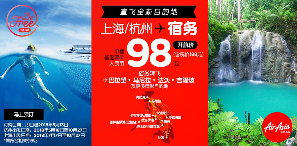 亚洲航空公司宣布开售两条全新航线:杭州-宿务和上海-宿务。杭州-宿务为亚航独家航线,此线将会在2018年5月18日首航,每周两班。而上海-宿务也将成为市场中极具竞争力的航线,此航线将会在2018年7月7日首航 ,通航后每天一班连接上海和宿务。