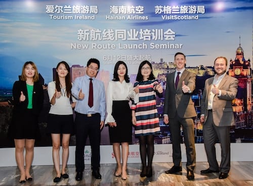 爱尔兰旅游局首次携手海南航空、苏格兰旅游局,在京举办同业培训活动,力推海航6月开通的北京-都柏林-爱丁堡航线。6月12日,海南航空将正式开通此条航班服务,带动中国前往爱尔兰岛以及苏格兰的旅游,为多边的旅游发展注入强劲动力。这也正是此次联合培训活动举办的重要原因——希望能够通过此次活动,帮助旅游同业更全面和深入地了解目的地的旅游资源和体验,同时更直观地感受海航航班优势,激发开发和丰富旅游产品的创意与灵感。