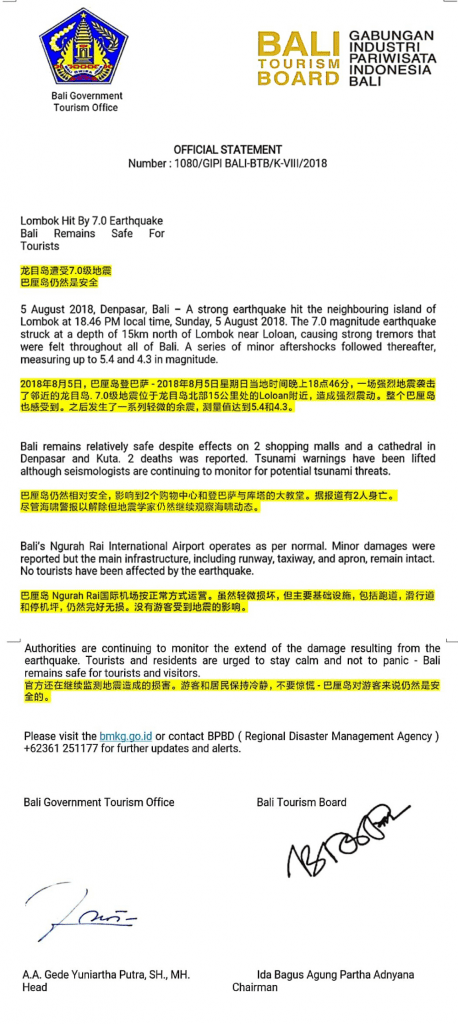 本次声明落款为巴厘省旅游局局长尤尼阿尔塔和巴厘岛旅游局主席Ida Bagus Agung Partha Adnyana,声明全文如下: