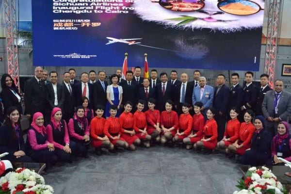 中国驻埃及大使宋爱国、埃及旅游促进理事会主席Ahmed Youssef、开罗机场董事长Ahmed Fawzy及川航董事长李海鹰等出席在开罗机场举行的首航欢迎仪式。