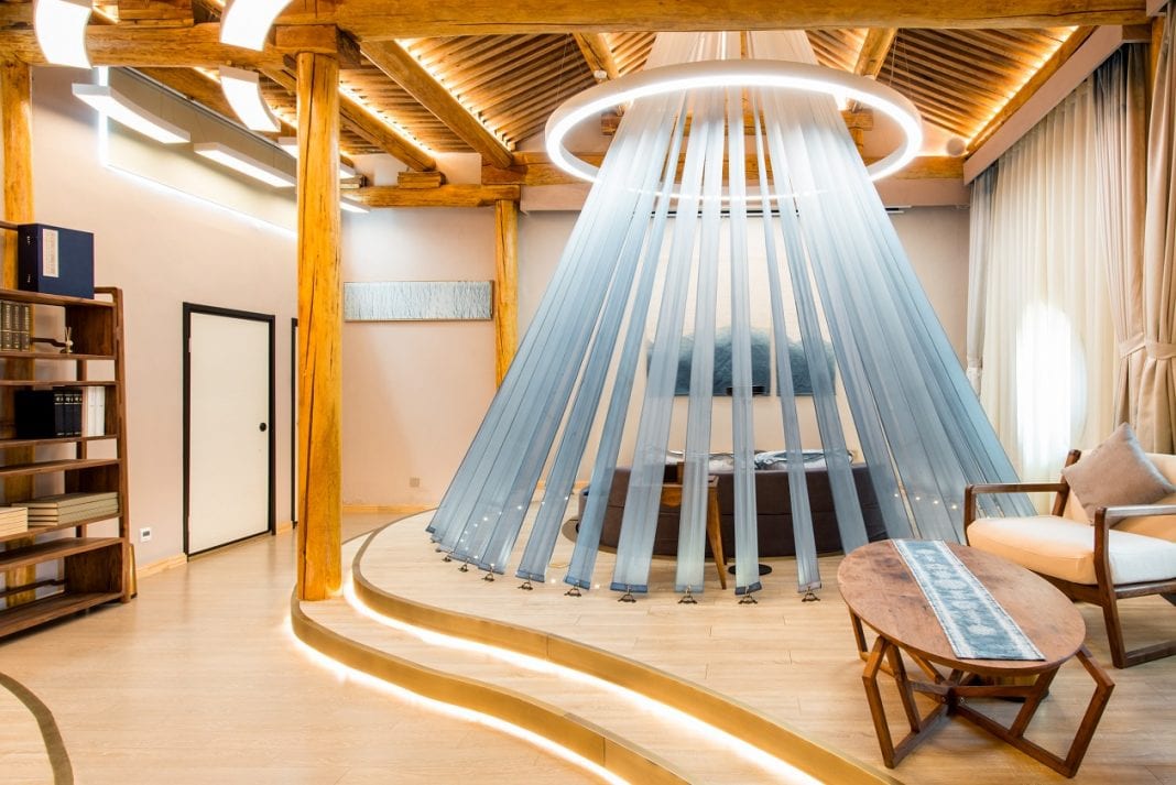 设计师将这间房源取名为“曲海流纱”,看弯曲的走道及台面就像蜿蜒流长的河道,将一张圆形大床环绕在“扎染”工艺的中心,柔软的美学基调在房间里蔓延开来,伴以中式家具纯朴恬静的氛围,提供给客人们茶饮、读书、小憩等各种怡然的休闲时光。通过别出心裁的设计,圆形床铺更能够下降至地面隐藏起来,如此灵活转化的空间,更夹杂了一丝现代感。
