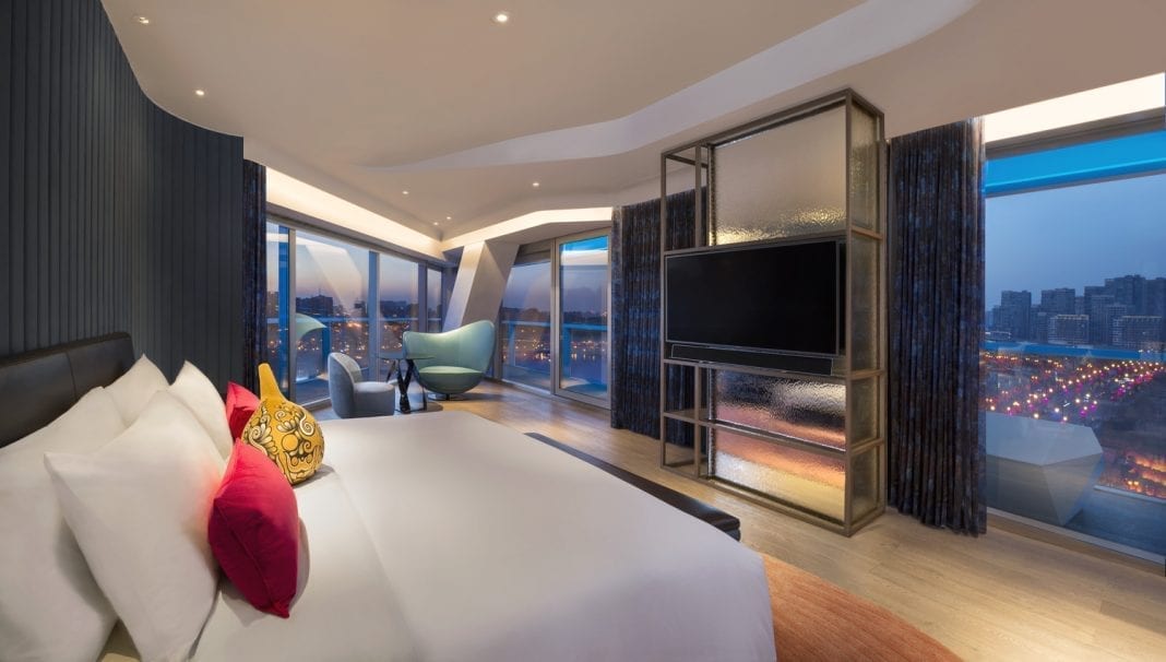 酒店385间客房及套房通过大胆炫丽的设计重新演绎西安文化,引导宾客去发现隐匿于房间内的重重惊喜。W特色标致睡床上的桃形饰物及摆放在床头的博物学家薛爱华(Edward Hetzel Schafer)所著的《撒马尔罕的金桃》也将引领宾客深度揭秘大唐盛世的金桃之谜。深入探寻,便可发现房间内四处可寻的趣味成语:服务指南——“通关文牒”,迷你吧——“食色性也”,吹风机——“吹毛求疵”,备用卷纸——“有备无患”这些结合古今文化的巧思妙想为宾客带来了无限的悬念和乐趣。客房及套房均配有开放式阳台,宾客可在沙发上恣享悠闲时光的同时,亦可俯瞰曲江池遗址的壮丽景观。酒店拥有73间宽敞明亮的套房,其中超越期待的Extreme WOW套房内生动的弧形墙面及沙漠色的波纹漆营造出了丝绸之路的非凡场景,充分展现了大唐盛世的繁荣景象。