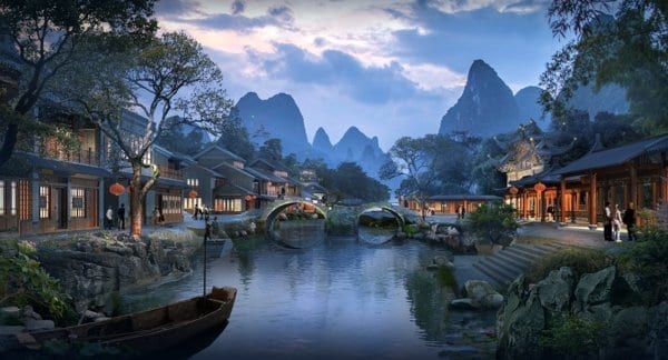 黄姚古镇·龙门街项目位于古镇的主入口,是游客进入古镇的第一印象区,与山、水、古镇构成大黄姚的旅游组团。项目总占地面积91亩,建筑面积5.2万平方米,以姚江和真武山为轴向周边延展,共分为“三桥七景”,其中包括仙人井、古戏台、书院、水车景观等等。该项目建成后将成为古镇升级扩容的主要空间和旅游服务的延展区。