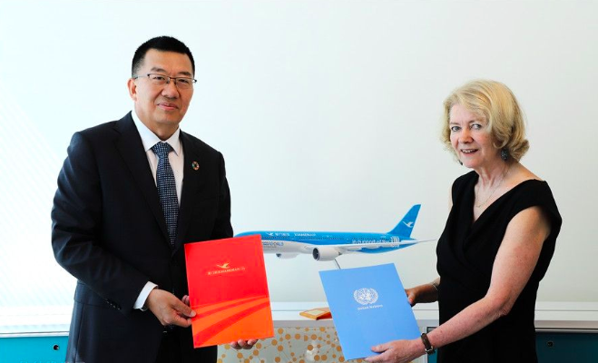 当地时间11日上午,厦航党委书记、董事长赵东在位于美国纽约联合国总部会见了联合国副秘书长艾莉森·斯梅尔,并交换了双方的合作协议文本。这是继去年初,他们在美国查尔斯顿举行的首架支持联合国可持续发展目标涂装飞机交付仪式后,再次相聚。合作协议文本的交换,标志着厦航与联合国合作期正式延长至2030年,与可持续发展目标计划至2030年同步。