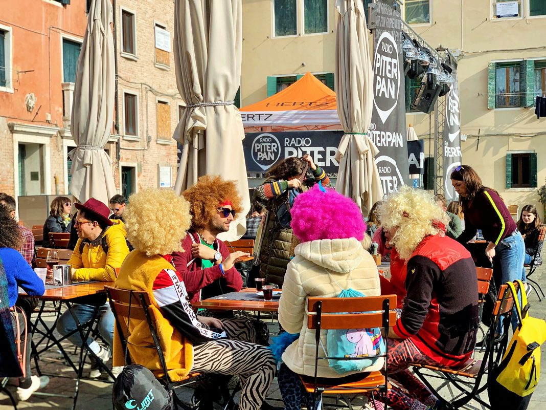 穿梭于广场小巷的面具艺人、擦肩而过的行人、贡朵拉上悠然自得的情侣、河岸两边咖啡馆裡幸福品尝提拉米苏和咖啡的一家人、路边攀谈的朋友,还有被爸爸妈妈推在婴儿车裡的小宝宝,每一个都被华丽的服饰装扮着,五彩斑斓俯拾皆是。