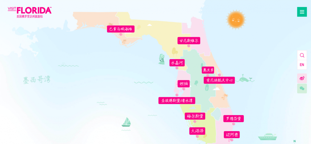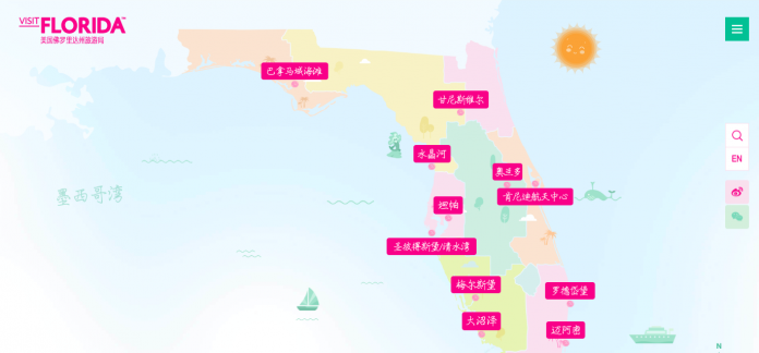 登录网站后,用户们会感觉仿佛置身于佛罗里达州的阳光下。页面设计清新整洁,标志、颜色、字体都体现了佛州的特色活力。页面会首先弹出一幅美国地图,佛罗里达州所在的位置会被特别标注,以强化用户对于佛罗里达州的地理位置的认知。地图上还标出了佛罗里达州许多著名的目的地,如:迈阿密、奥兰多、坦帕、罗德岱堡等。单击目的地名称后,会弹出主题介绍窗口,以便帮助用户进行快速导览。每个目的地都有专门的页面介绍,包括推荐景点、最优行程和最不容错过的精彩活动等。