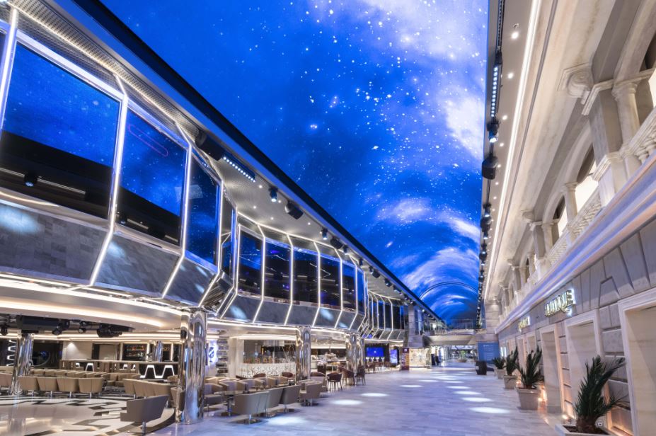 ・设计创新:作为地中海荣耀号上最有特色的标志之一,被誉为“海上香榭丽舍大道”的荣耀大道由长达80米的海上超长LED天幕覆盖,成就邮轮室内设计的奇景。这块天幕将成为亚洲最大的海上多媒体艺术载体,共使用了1.4亿枚LED灯泡和1,450块LED屏幕。在进入中国市场后,地中海荣耀号还将呈现专为中国设计打造的天幕秀。