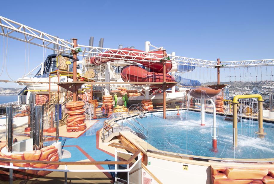 不仅是室内亲子娱乐,户外亲子体验方面,地中海荣耀号也为大小朋友带来了面积多达4,360平方米的亲子水上乐园。4大泳池区域,包括拥有3条滑水道和1座喜马拉雅桥,尽享妙趣横生的水上亲子时光。