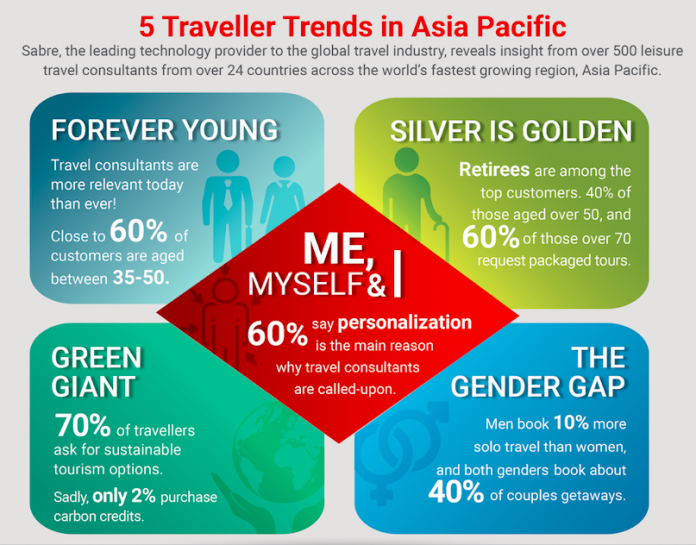 全球旅游业领先的技术提供商Sabre公司(纳斯达克股票代码:SABR)今天发布了一项亚太地区研究的结果。该研究总结了500多位旅行专业人士的见解。展望2020年,以下是由全球发展最快地区(亚太地区)超过24个国家的休闲旅游顾问所揭示的5大主要趋势。