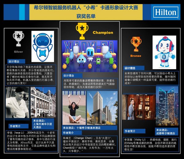 由希尔顿大中华区举办、为时一个月的“小希卡通形象大赛”揭晓。来自十堰希尔顿逸林酒店的陈琳芝设计方案获得大赛第一名,来自上海华尔道夫酒店李铭和成都希尔顿酒店李采薇的设计方案分别获得大赛第二和第三名。本届大赛受到了业内外的广泛关注和热情参与,投稿中约60%来自希尔顿宾客的设计。