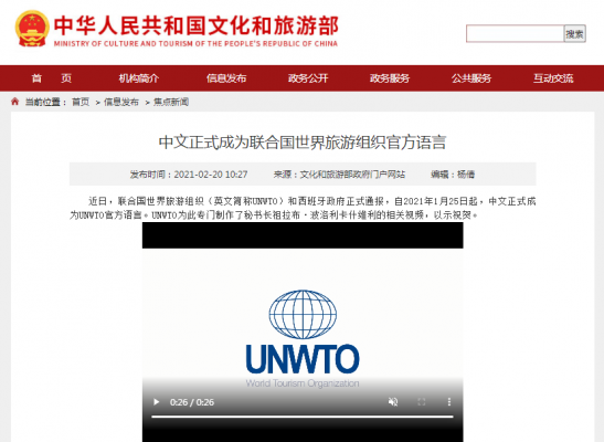 根据文旅部网站公告,近日,联合国世界旅游组织(英文简称UNWTO)和西班牙政府正式通报,自2021年1月25日起,中文正式成为UNWTO官方语言。