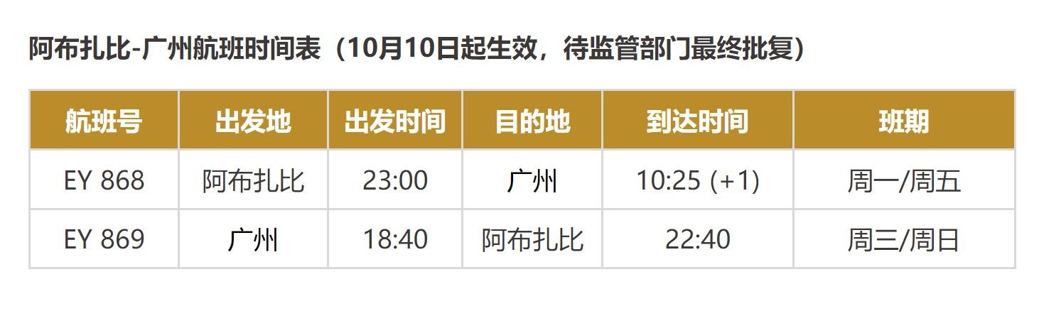 自2022年10月10日起,阿提哈德航空将提供每周四班阿布扎比往返中国的航班,其中两班直飞广州,另两班分别直飞北京与上海。
