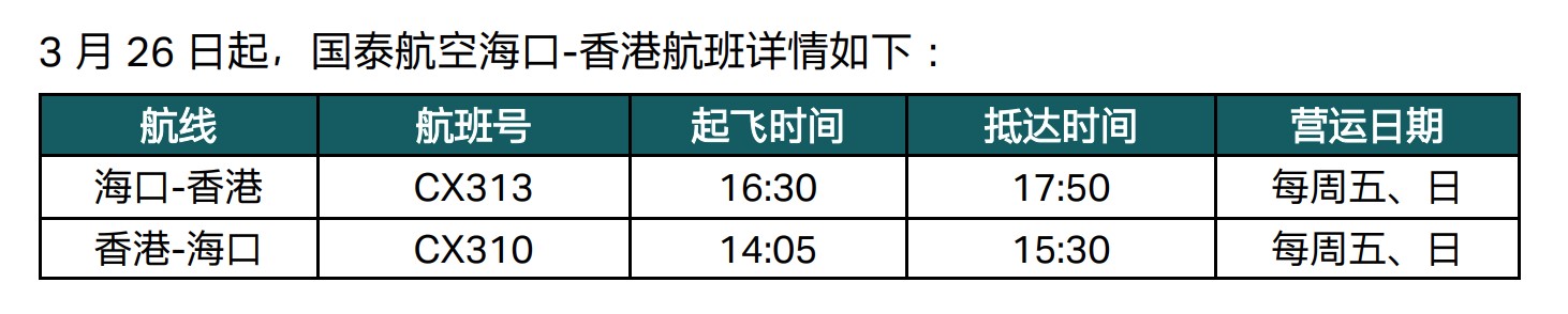 国泰航空进一步完善其内地服务网络,宣布将于3月26日起恢复每周两班往来海口与香港的客运航班服务,海口-香港航线将是国泰航空恢复的第十五条内地航线。