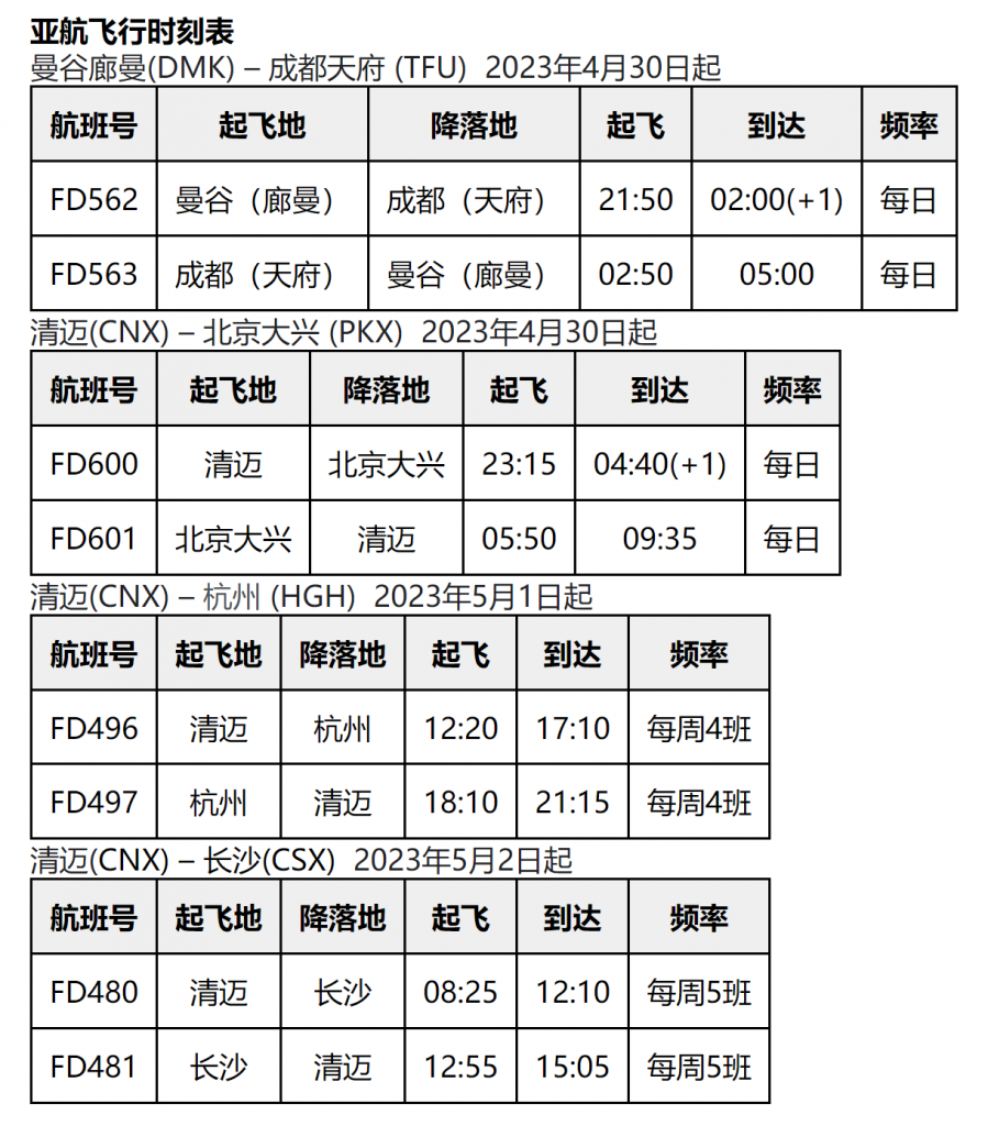 亚洲航空继续恢复其历史航班,第二季度开始游客前往泰国将有更多的选择。这次亚航将恢复4条直飞泰国的航线,分别是曼谷(廊曼)-成都(每周7班)、清迈-北京(每周7班)、清迈-杭州(每周4班)和清迈-长沙(每周5班)。这些航线将于2023年4月30日开始陆续投入运营。