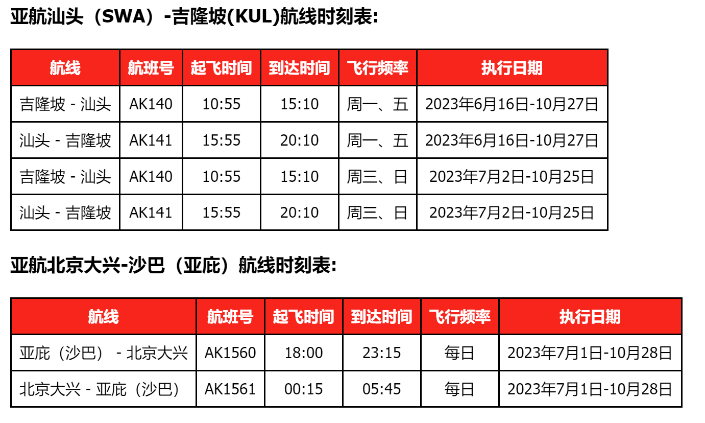 马来西亚亚航(代码AK)在中国的航线恢复依然继续。公司计划从6月16日开始恢复从汕头至吉隆坡的直飞航班;并于7月1日恢复从北京大兴到沙巴(亚庇)的直飞航线。