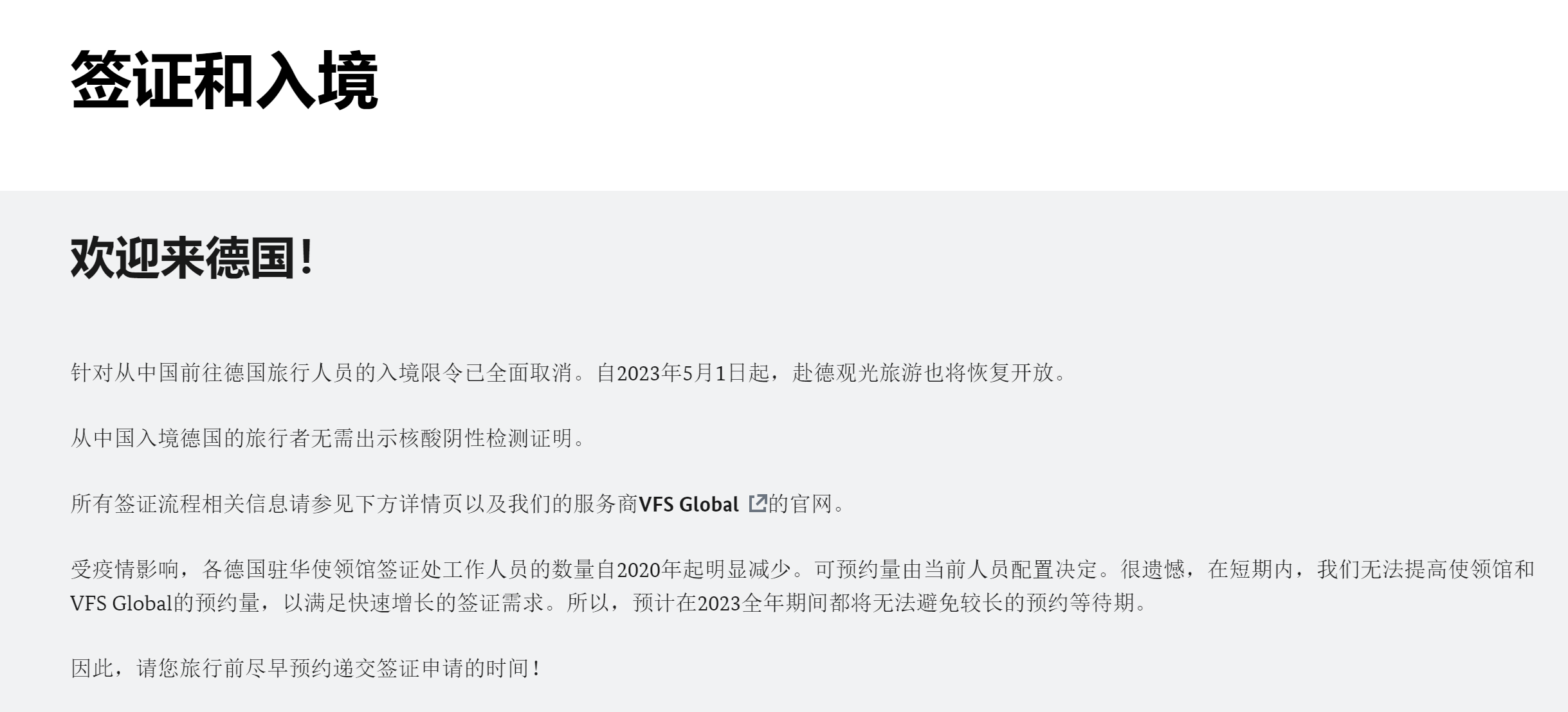焦点新闻 德国5月1日起对中国公民重新开放旅游签证 By TTG China / Posted on 21 April, 2023 12:57 4月20日,据德国驻华大使馆官方网页消息,自2023年5月1日起,德国将对中国公民重新开放旅游签证申请。 德国驻华大使馆官网更新了有关签证申请的最新消息,针对从中国前往德国旅行人员的入境限令已全面取消。自2023年5月1日起,赴德观光旅游也将恢复开放。不过,由于目前德国在华签证中心人力不足,部分类别的签证批准等待时间可能长达数周。 今年3月1日,德国取消了自2020年起实施的针对从中国赴德旅行人员的入境限令。2月22日起,旅行者从中国入境德国也不再需要出示核酸阴性检测证明。