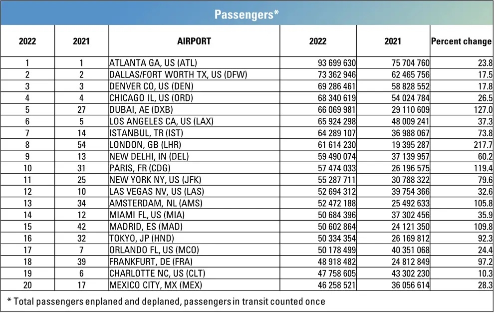 (钟韵/ 采访报道)国际机场理事会昨(19)日发布了最新的全球机场流量数据报告。报告显示,2022年全球机场客流量超过66亿人次,国际航空市场复苏良好;报告并发布了前20名全球最繁忙机场,在客运方面,美国机场占据半壁江山,其中,亚特兰大机场拔得头筹。