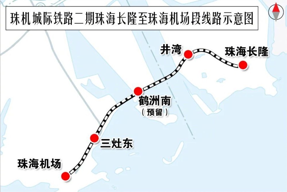 珠机城际横琴至珠海机场段线路自城际横琴长隆站引出,沿线设井湾、鹤州南(预留)、三灶东高架站,至珠海机场站,线路总长约22.8公里,设计时速160公里。项目运营后,珠海市中心城区(拱北)、横琴到珠海金湾机场最快用时分别为38、24分钟。珠机城际铁路二期自2018年起开工建设。