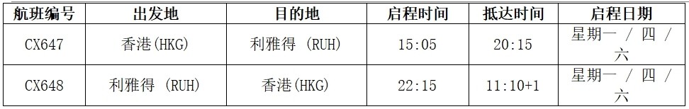 每周三班由香港往返利雅得的国泰航班将由空中巴士A350-900客机营运,备有商务客舱、特选经济客舱及经济客舱以供选择。航班时间如下(皆为当地时间,需经过相关机构核准):