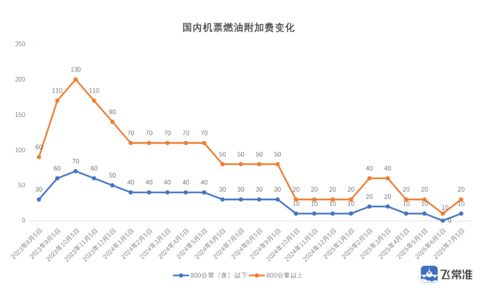 焦点新闻 中国国内燃油附加费7月5日起上调 By TTG China / Posted on 2 July, 2025 11:09 自2025年7月5日(含出票日期)起,调整国内航线旅客运输燃油附加费征收标准。相较于此前标准分别上涨了10元。 自2025年7月5日(出票日期)起,国内所有航线燃油附加费收取标准为:800公里(含)以下航线每位成人旅客收取10元燃油附加费,800公里以上航线每位成人旅客收取20元燃油附加费。