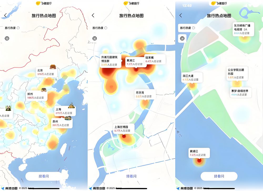 近日,飞猪AI旅行助手“问一问”推出新功能,可提供旅行热力地图服务,帮助用户查看目的地客流热度,更合理规划出行安排。
