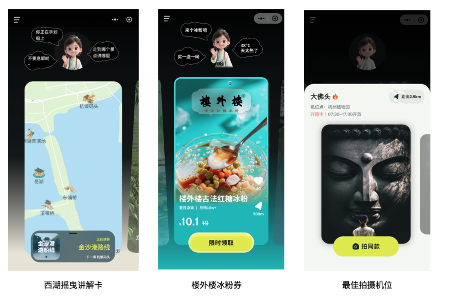 区别于传统行程规划类助手,“泡泡爱旅行”专注于游客在景区内的实时需求。该系统通过识别游客位置、环境温度等场景因素,提供个性化推荐:如在游船时自动启动景观讲解,高温时推送清凉饮品券,靠近拍照点时提示最佳机位。试点数据显示,游客在旅途中对该智能体的平均使用频次达3-5次,满意度达96%。