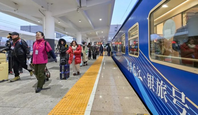 12月28日,黑龙江首趟冰雪环线旅游列车“悠享龙江·银旅号”从哈尔滨驶往亚布力,标志着为期6天的精品冰雪游环线正式启航。来自江苏、浙江、上海等地的240名游客成为首批体验者。