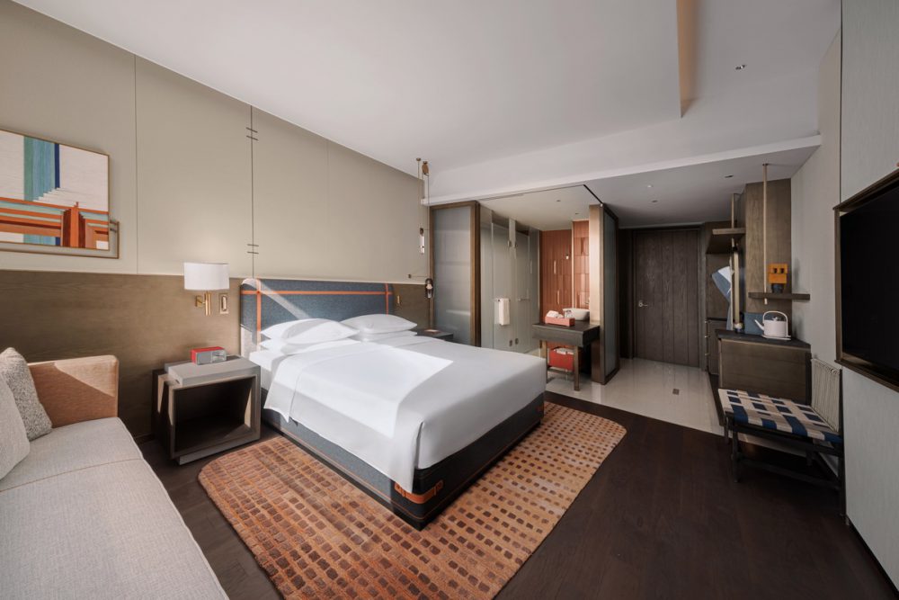酒店由国际知名设计公司 HBA 倾力打造,通过当代视角重新诠释传统工艺之美,将科学理性、艺术表达与人文温度融于一体。落地窗引入城市天际线,自然光线在空间中流动,构建出兼顾功能性与情感共鸣的居住体验,为商务出行、休闲度假与长住客人提供自在而松弛的栖居选择。